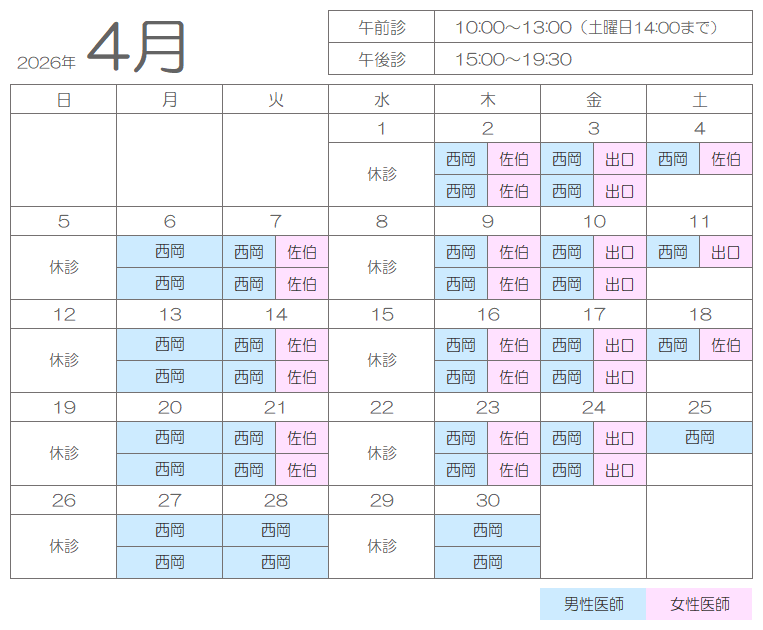 2026年4月 担当医・診療カレンダー